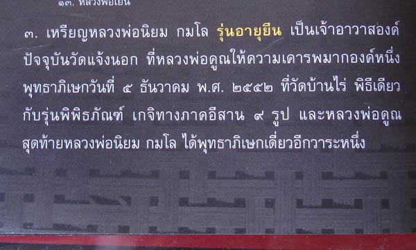....พุทธาภิเษก 4 ตุลาคม 2552 ร่วมพิธี หลวงพ่อคูณ ปริสุโธ วัดบ้านไร่ งานพิพิธภัณฑ์หลวงพ่อคูณ และหลวงพ่อนิยมได้ทำพิธีพุทธาภิเษกอีกหนึ่งวาระ