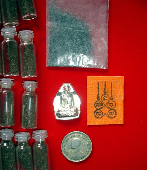 1. หลอดแก้วที่มี ผงฟ้าผ่า หลวงพ่อพรหม, ว่านมงคล 108, ผงงิ้วดำ, เกศา หลวงพ่อ