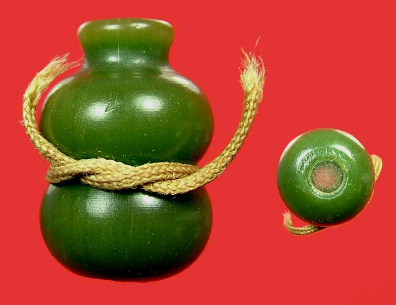 ส่วนอีกชิ้นเป็นน้ำเต้ารุ่นแรก หลวงพ่อสด วัดปากน้ำ กทม. ภายในเป็นรูปขาวดำ รุ่นนี้ผลิตในประเทศญี่ปุ่นประมาณ พ.ศ.2500 สีเขียวหยก น่ารักดีครับ |
