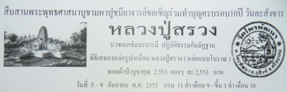 เชิญร่วมกัน สืบสานพระพุทธศาสนามหาปูชนียาจารย์ หลวงปู่สรวง เทวดาเล่นดิน ทำบุญครบรอบ 10ปี วันละสังขาร ร่วมบวชเนกขัมมะบารมี ปฎิบัติธรรมกัมมัฏฐาน และร่วมพิธีเททองหล่อรูปเหมือน หลวงปู่สรวง (หล่อแบบโบราณ) ทอดผ้าป่าบูชาคุณ2,553 กองๆละ 2553บาท
