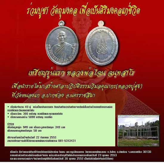 บัดนี้ถึงเวลาที่เหมาะสมของหลวงพ่อเอง ท่านได้อนุญาตให้จัดสร้างเหรียญรุ่นแรกขึ้น เพื่อจะได้นำปัจจัยทั้งหมดที่เหลือจากค่าใช้จ่าย จะได้นำไปต่อเติมศาลาส่วนที่เหลือให้ได้มากที่สุด ( ทั้งนี้หลวงพ่อบอกว่า ตั้งแต่บวชมา ไม่เคยสร้างวัตถุมงคล นอกจาก ท้าวเวสสุวรรณ และ สากกระเบือ ซึ่งนี้นั้นก็ล่วงมา 20 กว่าปีแล้ว สมัยนั้น หนังสือนะโมยังมาขอลงประวัติท่านทั้งๆที่เป็นพระหนุ่มอายุยังไม่เท่าไหร่ เรื่องวัตถุมงคลนั้นจะเล่าในโอกาสต่อไปคับ )