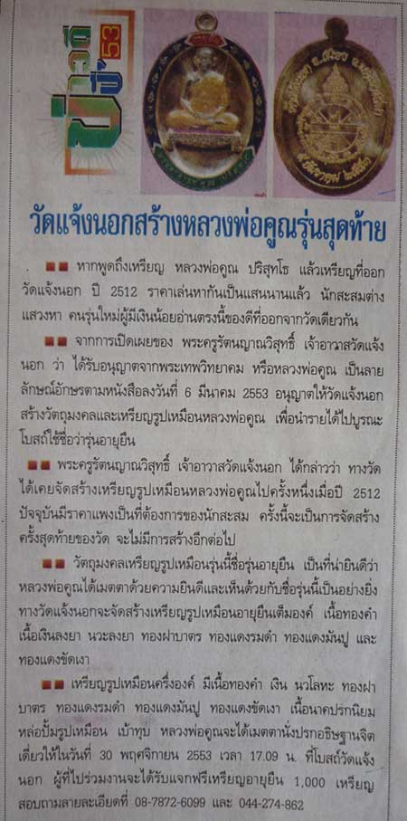 ก่อนอื่นต้องขอขอบคุณ และขออนุญาตนำภาพและคอลัมน์บางส่วนจากหนังสือพิมพ์บ้านเมือง ฉบับวันที่ 27 กันยายน 2553. .ที่ผ่านมา ที่ได้นำเสนอข้อมูลเกี่ยวกับการจัดสร้างวัตถุมงคลของวัดแจ้งนอก รุ่น "อายุยืน" อย่างถูกต้องสมกับเป็นหนังสือพิมพ์ที่มีผู้อ่านยอมรับทั่วประเทศ.........