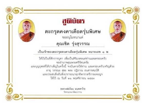 | หัวข้อกระทู้ : ## ใบสูติบัติตะกรุดใต้น้ำครั้งประวัติศาสตร์หลวงพ่อไฉน วัดหนองแก สำหรับผู้ที่จองตะกรุดใต้น้ำไว้คับ ## |