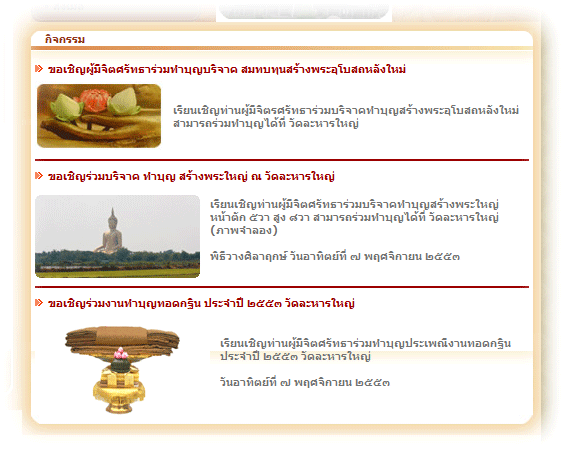 1 งานบุญทอดกฐินวัดละหารใหญ่ วันอาทิตย์ ที่ 7 พฤศจิกายน 2553 ตั้งองค์กฐินวันที่ 6 พฤศจิกายน 2553 (ซองกฐิน เริ่มรับตั้งแต่วันตั้งองค์กฐินวันที่ 6 พฤศจิกายน 2553 ครับ)