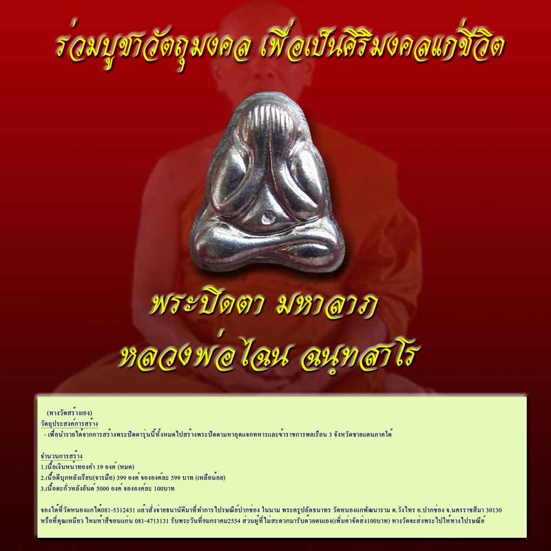 จองได้ที่วัดหนองแกได้081-5312431 แล้วสั่งจ่ายธนานัติมาที่ทำการไปรษณีย์ปากช่อง ในนาม พระครูปลัดธนาทร วัดหนองแกพัฒนาราม ต.วังไทร อ.ปากช่อง จ.นครราชสีมา 30130 หรือที่คุณเหมียว ไหมห้าสีขอนแก่น 081-4713131 รับพระวันที่9มกราคม2554 ส่วนผู้ที่ไม่สะดวกมารับด้วยตนเอง(เพิ่มค่าจัดส่ง100บาท) ทางวัดจะส่งพระไปให้ทางไปรษณีย์ |