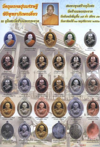 หลวงพ่อแถม วัดช้างแทงกระจาด ศิษย์หลวงพ่อทองศุข วัดโตนดหลวง เกจิฯ ผู้โด่งดังแห่งเมืองคนจริงเพชรบุรี ภาพนี้พุทธาภิเษกพร้อมเหรียญรุ่นเศรษฐี ซึ่งออกให้บูชาไม่นานแต่เป็นที่แสวงหากันมากทั้งในพื้นที่และส่วนกลาง ด้วยเป็นวัตถุมงคลซึ่งมีเจตนาบริสุทธิ์ คือรายได้เพื่อสมทบทุนสร้างอุโบสถหลังใหม่ วัดช้างแทงกระจาดให้แล้วเสร็จ วัตถุมงคลชุดนี้มีจำนวนสร้างที่ชัดเจน และรูปแบบที่สวยงาม เข้มขลังด้วยพุทธคุณ ตามแบบฉบับเกจิฯ สายเพชรบุรี อีกหน่อยจะต้องเป็นที่แสวงหากันอย่างแน่นอน ภาพนี้ผมได้มาจำนวนหนึ่งจึงอยากจะให้เป็นของขวัญปีใหม่สำหรับผู้ที่ต้องไปบูชาเพื่อความเป็นศิริมงคล จำนวน 19 ภาพ แจกท่านละ 1 ภาพเท่านั้นเพียงโพสชื่อที่อยู่ไว้ ผมจะจัดส่งให้โดยไม่คิดค่าใช้จ่ายครับ |