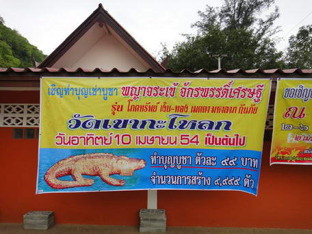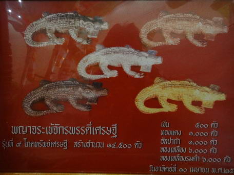 พญาจระเข้ จักรพรรดิ์เศรษฐี รุ่นใหม่นี้ ที่ปากพญาจระเข้ จะสร้างเป็นรูปจระเข้คาบเงินคาบทอง บุคคลใดได้ไปบูชา ไว้ก็จะเป็นเมตตา มหานิยม มหาโชค มหาลาภ แคล้วคลาดกันภัย รุ่นนี้ถือเป็นรุ่นมหามงคลเพราะเป็นรุ่นที่ 9 เป็นเลขมงคล โดยออกให้ทำบุญเช่าบูชาที่วัดเขากะโหลกแห่งเดียวเท่านั้น ตั้งแต่วันที่ 10 เมษายน 2554 เป็นต้นไป จำนวนสร้าง 14,500 ตัว เนื้อเงิน 500 ตัวมีจำกัด ตัวละ 1,500 บาท อัลปาก้า 1,000 ตัวๆละ 500 บาท ทองแดง 1,000 ตัวละ 300 บาท ทองเหลือง 6,000 ตัว และทองเหลือรมดำ 6,000 ตัว ในราคาตัวละ 99 บาท เคล็ดลับการบูชานำพญาจระเข้ อาราธนาติดตัว ติดรถ ติดเรือ ติดบ้านเรือนค้าขายหรือใส่แก้ว ใส่น้ำตั้งบูชา ได้ผลดีมาก ผู้ที่สนใจติดต่อสอบถามได้ที่วัดสุมนาวาส(เขากะโหลก) ต.ปากน้ำปราณ อ.ปราณบุรี จ.ประจวบคีรีขันธ์ 77220 โทร. 032-630-729 และ 032-630-731 |