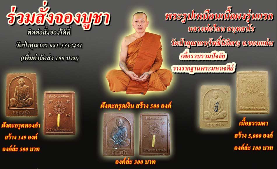 จึงขอเรียนเชิญพี่ๆ เพื่อนๆ ชาวเว็บจี ร่วมบุญสร้างพระมหากุศลอันยิ่งใหญ่ในครั้งนี้ หรือพี่ๆท่านใดผ่านขอนแก่น แวะไปทางอำเภอบ้างฝางเพียง 20 กิโลเมตร ลองเข้าไปกราบนมันสการพระเดชพระคุณหลวงพ่อท่านซักครั้ง รับรองไม่ผิดหวังจะด้วยธรรมะหรือธรรมะเทศนา ด้วยเป็นพระที่ตรงๆ ไม่เลือกว่าใครหน้าไหน ยาก ดี มี จน ถ้าท่านช่วยเหลือได้ท่านช่วยเหลืออย่างเต็มที่ แม้คนอยากบวชไม่มีปัจจัย หลวงพ่อท่านก็ออกให้เองทุกประการ วัตถุมงคลสามารถสั่งจองที่วัดโดยตรง ไม่มีกรรมกงกรรมการใดๆทั้งสิ้นคับ