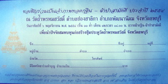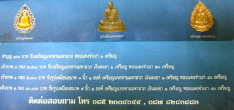 ร่วมเป็นเจ้าภาพ ๑ กอง ๕๐๐๐ บาทรับรูปเหมือนขนาด ๓ นิ้ว ๑ องค์ เหรียญแจกทานมหาลาภเนื้อเงินลงยา ๑ เหรียญ เนื้อทองแดงจ่าเงา ๔๐ เหรียญ