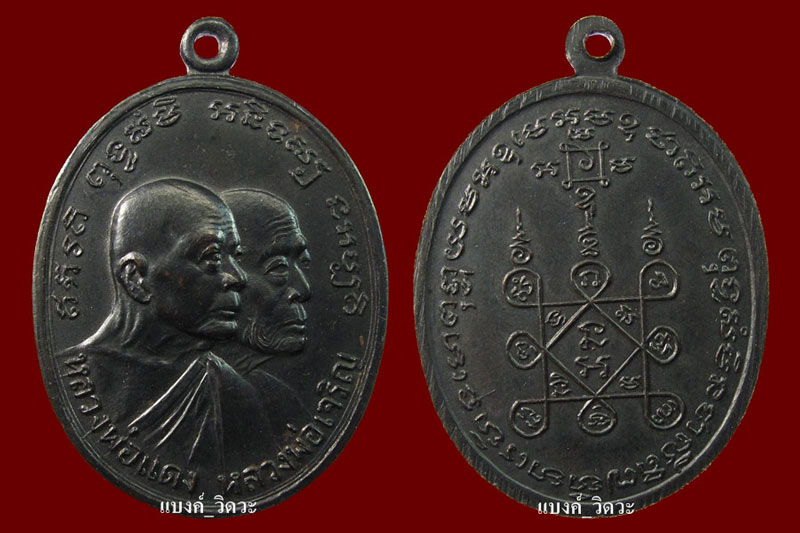 หลวงพ่อเจริญ หรือ พระครูปัญญาโชติวัฒน อดีตเจ้าอาวาสวัดทองนพคุณเป็นน้องชายร่วม บิดา-มารดาเดียวกับหลวงพ่อแดง มีอายุอ่อนกว่าหลวงพ่อแดง 5 ปี มีความต้องการที่จะจัดสร้างเหรียญรูปซ้อนขึ้นเพื่อหาเงินมาสร้างและซ่อมแซมสิ่งก่อสร้างและถาวรวัตถุภายในวัดทองนพคุณ จ.เพชรบุรี จึงได้เข้าไปปรึกษาหลวงพ่อแดง ผู้เป็นพี่ชาย เมื่อตกลงกันเป็นที่เรียบร้อยแล้วหลวงพ่อเจริญจึงจัดสร้างขึ้นในปี 2512 แล้วนำไปให้หลวงพ่อแดงปลุกเสกก่อน 1 พรรษา ภายหลังจึงจัดทำพิธีพุทธาภิเษกขึ้นที่วัดทองนพคุณ หลวงพ่อแดง วัดเขาบันไดอิฐ ท่านจะไม่รับกิจนิมนต์นอกจังหวัดเพชรบุรี โดยเฉพาะการปลุกเสกวัตถุมงคล วิธีปลุกเสกของท่านคือท่านจะปลุกเสกเดี่ยวหากต้องการให้หลวงพ่อแดงปลุกเสกวัตถุมงคลต้องนำมาที่วัดเขาบันไดอิฐเท่านั้น ยกเว้นการปลุกเสก 2 ครั้งที่ท่านยอมไปปลุกเสกนอกวัดเขาบันไดอิฐ
