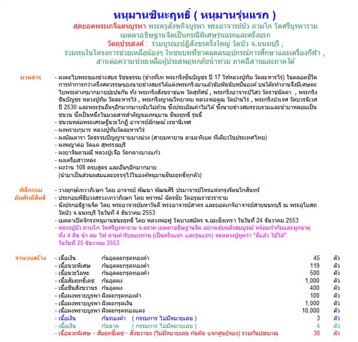 วันนี้จึงขอมานำเสนอ หนุมานชินะฤทธิ์ ( หนุมานรุ่นแรก ) ของพระอาจารย์บัว ถามโก ซึ่งกำลังเป็นที่นิยมและกระแสแรงมากๆในขณะนี้ ทั้งตามศูนย์พระต่างๆ และเว็บเพื่อนบ้าน ซึ่งสมาชิกชาวเว็บจีหลายๆท่านอาจจะยังไม่ทราบข่าวและความเคลื่อนไหว ยังไงรองเช็คราคากันดูก่อนที่จะแบ่งให้พรรคพวกเช่า-บูชากันนะครับ ^^