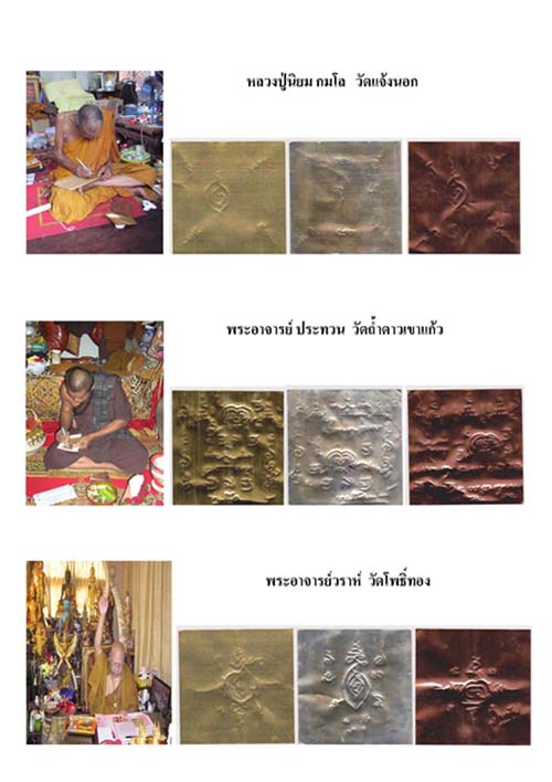 จากครั้งที่แล้วได้แจ้งให้ทราบถึงวันคล้ายวันเกิดหลวงปู่นิยม กมโล แห่งวัดแจ้งนอก ว่า จะมีการจัดงานในวันที่ 17 กุมภาพันธ์ 2555 บรรดาลูกศิษย์ของหลวงปู่และคณะศิษย์เก่าราชสีมา ๗๕ ได้ร่วมใจกันจัดสร้างวัตถุมงคลต่างๆ เพื่อมาแจกให้กับผู้ที่เข้าร่วมงาน ผมได้นำภาพบางส่วนมาเพื่อให้ทุกๆท่านได้ทราบว่า คณะผู้สร้างมีการนำแผ่นชนวนจากพระเกจิ อาจารย์หลายๆท่านที่เป็นที่รู้จัก เคารพนับถือ ของประชาชนจำนวนมากมาเป็นชนวนให้กับวัตถุมงคลที่จะสร้างขึ้น ได้แก่ หลวงปู่นิยม (วัดแจ้งนอก) พระอาจารย์ประทวน ( วัดถ้ำดาวเขาแก้ว ) พระอาจารย์วราห์ (วัดโพธิ์ทอง) ท่านได้มีเมตตาจารอัคระลงใน แผ่นทอง แผ่นเงิน และแผ่นทองแดง เพื่อนำไปเป็นชนวนของวัตถุมงคลต่างๆ ที่จะสร้างขึ้นในงานนี้และได้ขออนุญาตให้พระเกจิ พระอาจารย์ อีกหลายๆท่านร่วมอธิฐานจิตปลุกเสกให้อีกด้วย เพื่อให้งานฉลองวันเกิดหลวงปู่นิยม กมโล อายุครบ 94 ปี เป็นไปตามวัตถุประสงค์ เป็นสิริมงคลของการสร้างวัตถุมงคล โดยใช้ชื่อรุ่นนี้ว่า เมตตา มหานิยม