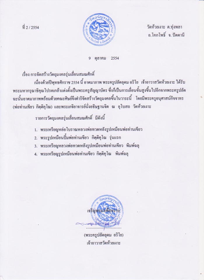 เปิดจอง ช่วงเดือนพฤศจิกายน 2554 รับพระ ประมาณ มีนาคม 2555 ช่วงเวลานี้ มีเปิดจองอย่างเป็นทางการในนามวัดห้วยเงาะ แค่รุ่นนี้ รุ่นเดียวเท่านั้น ส่วนรุ่นอื่นๆ วัดห้วยเงาะ ไม่ขอรับรู้ ไม่ขอรับทราบ และขอบอกว่า เงินปัจจัย ทุกบาท ทุกสะตางค์ วัดห้วยเงาะไม่รับทราบ จบข่าว |
