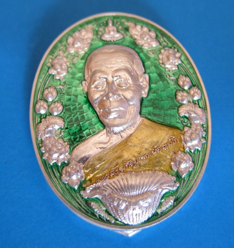 3.เหรียญเงินลงยาสีเขียวขุดพื้น สร้างจำนวน 299องค์ ราคา จอง (จากวัด) 3000 มียอด 10องค์