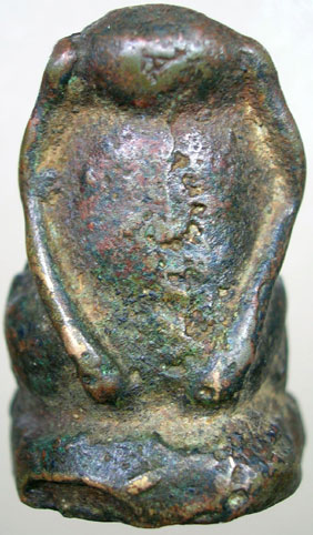 พระปิดตาเนื้อโลหะผสมหรือจะเรียกรวมว่า เนื้อสัมฤทธิ์ เทแบบทุบเบ้าโดยวิธีโบราณคือการปั้นหุ้นเทียนทีละองค์ และมีโลหะอะไร ก็หลอมรวมกัน จะเห็นเนื้อทองคำถูกเทปนบริเวณลำแขนองค์พระ ซึ่งพิมพ์พระไม่มีโอกาสเหมือนกัน ถ้าเหมือนกันได้ตีเก้ไปเลยครับ การดูโลหะหล่อโบราณ หรือดูของเก่า ต้องเน้นดูตามซอกครับ ตามซอกเป็นจุดที่ทำให้เก่าไม่ได้ เพราะเป็นผิวด้านใน พระองค์นี้ตามซอก ฟ้องความเก่ามากครับ อายุน่าจะประมาณ 60 ปี ขึ้นไปนั่นก็คือ ราวปี 2485 ขึ้นไปครับ