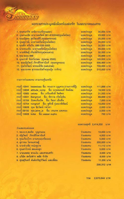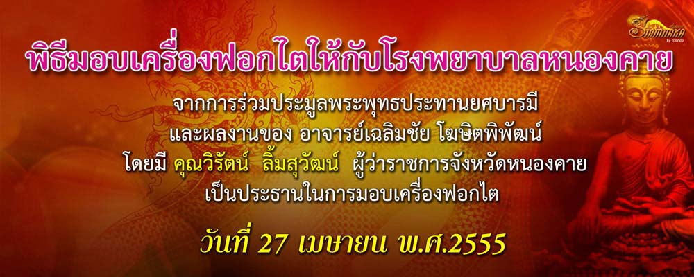 เรียน อาจารย์เฉลิมชัย ที่เคารพครับ พิธีมอบเครื่องฟอกไต รายล่ะเอียดตามนี้นะครับ ทางสถานที่จัดตั้งของเครื่องฟอกไตเพื่อผู้ป่วยโรงบาลหนองคายได้มีการจัดสร้างตึกผู้ป่วยพร้อมใช้งานแล้วนะครับ ดังนั้นเราจึงจะทำพิธีส่งมอบตามวัตถุประสงค์ที่ได้กราบเรียน อาจารย์ครั้งที่ได้ไปหาอาจารย์เมื่อปีก่อนแล้วนะครับ พิธีการส่งมอบวันที่ศุกร์ 27 เมษายน 2555 เวลาประมาณบ่ายโมงนะครับที่ตึกอาคาร เมตตาบารมี หลวงปู่ขาว อนาลโย โดยมีรายล่ะเอียดดังนี้นะครับ 1.มอบเครื่องฟอกไต จำนวน3 เครื่องให้โรงพยาบาลจังหวัดหนองคายจำนวน 3 เครื่อง ผู้รับมอบผู้อำนวยการโรงพยาบาล จ.หนองคาย 2.มอบเครื่องฟอกไตให้กับโรงพยาบาล อำเภอโพนพิสัย จ.หนองคาย จำนวน 1 เครื่อง และเตียงผู้ป่วย จำนวน 6 เตียง ผู้รับมอบผู้อำนวยการโรงพยาบาล อ.โพนพิสัย จ.หนองคาย |