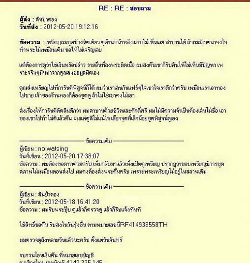 เมล์ที่ผมส่งไปไม่มีใครว่าผมแม้แต่คนเดียว ทุกคนให้ผมดำเนินการเต็มที่ และเมื่อไปดูข้อมูลผมก็เคยซื้อพระกับคุณด้วย รายการสุดท้ายเหรียญถูกไฟไหม้มาผมก็ไม่คืนเพราะดูแล้วไม่เก้เป็นพอ