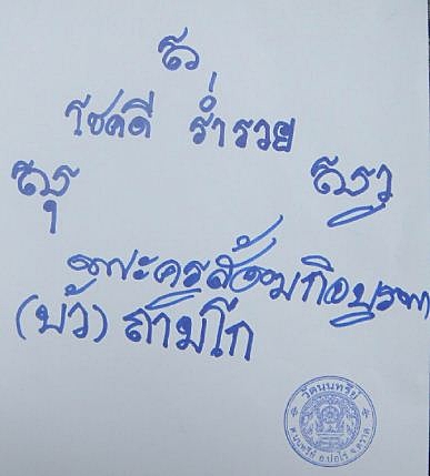 ท่านเลยเมตตาจารเป็นคำอวยพรให้แทน ให้ผู้ที่นำไปใช้ มีแต่ความโชคดี มีความสุข ร่ำรวย เพื่อใช้พิมพ์ลงในตะกรุดทองคำที่จะบรรจุด้านหลังเสมาฉลุ หลวงปู่บัว รุ่นบงกชบูรพาทุกรุ่น ทุกองค์ รวมทั้งเนื้อทองระฆังด้วย