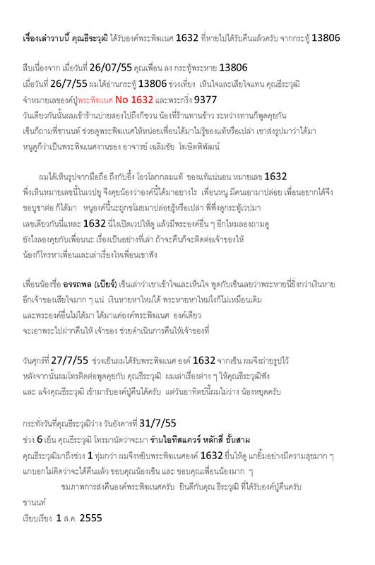 สืบเนื่องจาก เมื่อวันที่ 26/07/55 คุณเพื่อน ลง กระทู้พระหาย 13806 เมื่อวันที่ 26/7/55 ผมได้อ่านกระทู้ 13806 ช่วงเที่ยง เห็นใจและเสียใจแทน คุณธีระวุฒิ จำหมายเลของค์ปู่พระพิฆเนศ No 1632 และพระกริ่ง 9377 วันเดียวกันนั้นผมเข้าร้านบ่ายสองไปถึงก็ชวน น้องที่ร้านทานข้าว ระหว่างทานก็พูดคุยกัน เซ็นก็ถามพี่ชานนท์ ช่วยดูพระพิฆเนศให้หน่อยเพื่อนได้มาไม่รู้ของแท้หรือเปล่า เขาส่งรูปมาว่าได้มา หนูดูก็ว่าเป็นพระพิฆเนศงานของ อาจารย์ เฉลิมชัย โฆษิตพิพัฒน์ |