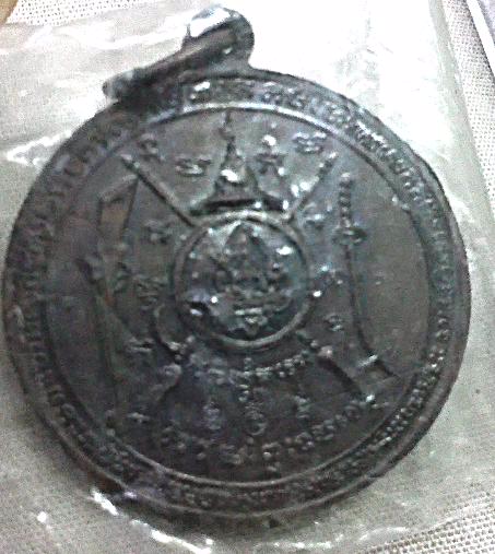 ด้านหลังเหรียญนี้...เป็นรูป พระมาลา โล่ห์ ดาบ พระแสงปืน ศาสตราวุธ...