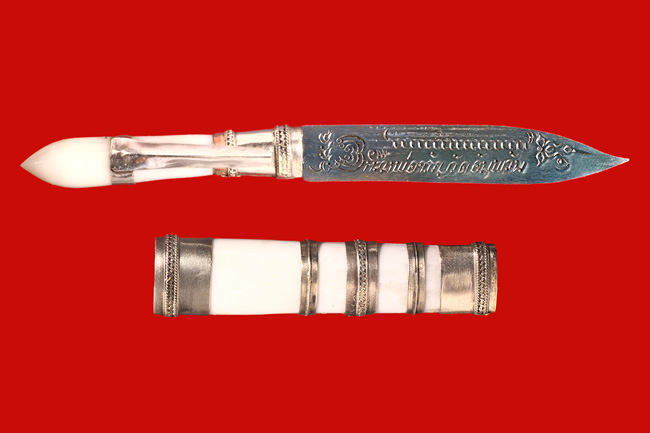บรรจุใว้ใน "มีดเทพศาสตรา" ให้เราๆท่านๆได้มีไว้ป้องกันภัยอันตรายต่างๆได้ดีไม่แพ้ของหลวงพ่อเดิมเลย หากแต่ต่างกันที่ "ราคา" ที่ให้เราๆท่านๆหาเป็นเจ้าของกันได้ ไม่ยากอย่างที่เคย... |