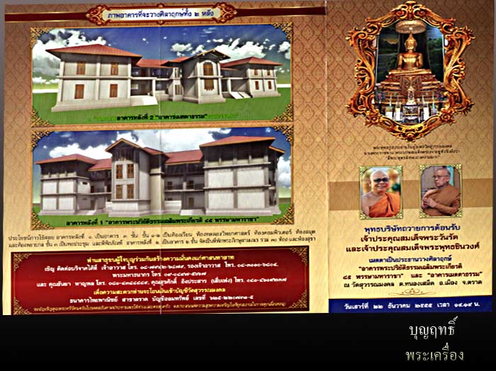 ขอเชิญร่วมงาน วางศิลาฤกษ อาคารพระปริยัติธรรมเฉลิมพระเกียรติ 85 พรรษาหหาราชา และอาคารเมตตารธรรม โดยเจ้าประคุณสมเด็จพระวันรัต และเจ้าประคุณสมเด็จพระพุทธชินวงศ์ และหลวงปู่บัว ถามโก อ่านประวัติโดย ย่อของวัด สุวรรณมงคล ที่พระเจ้าตากได้สร้างไว้และพระพุทธศิลปสมัยอู่ทอง อันเชิญมาจากกรุงธนบุรี อายุหลายร้อยปี พิธีในวันที่22ธันวาคม 2555 ในงานมีเหรียญหยดน้ำกะไห่ลทองปลุกเศกเดี่ยว โดยหลวงปู่บัว ถามโก วัดเกาะตะเคียน จ.ตราดเมื่อปี 54 สร้างทั้งหมดจำนวน1000เหรียญเป็นเหรียญบล็อคแตกทั้งหมด ให้บูชา ในวันงานด้วยนะครับ สวยมากครับ |