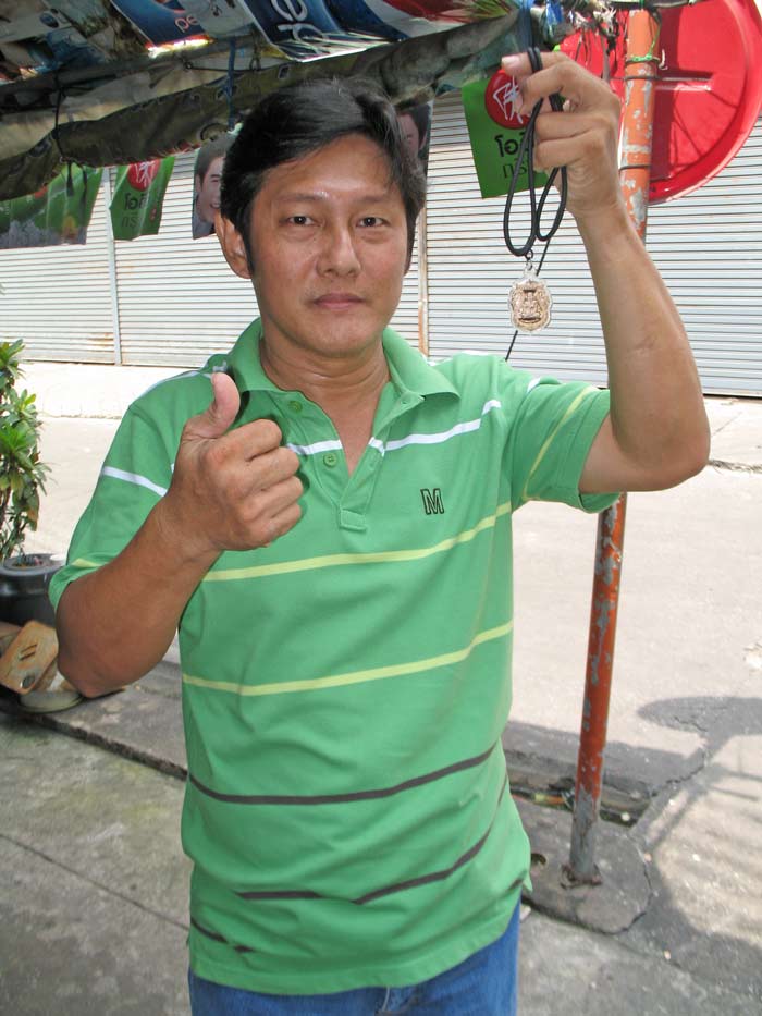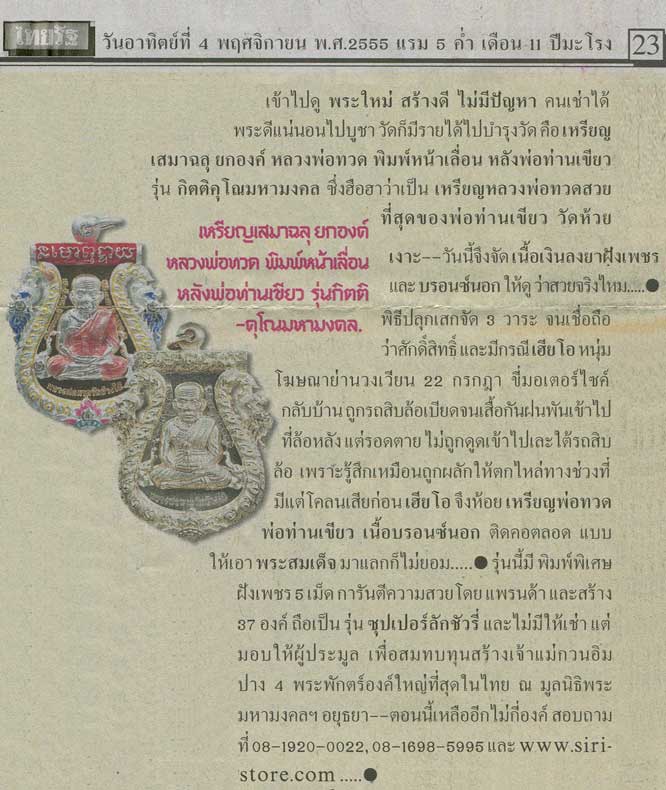 เหรียญเสมาฉลุยกองค์ลพ.ทวด พิมพ์หน้าเลื่อนหลังพ่อท่านเขียว รุ่นกิตติคุโณมหามงคล นี้เป็นที่ฮือฮามากเมื่อช่วงต้นปี 2555 เพราะเป็นเหรียญลพ.ทวดที่สวยที่สุดของพ่อท่านเขียว วัดห้วยเงาะ และจัดพิธีปลุกเสกถึง 3 วาระ ล่าสุดมีประสบการณ์กับหนุ่มทำโฆษณาย่านวงเวียน 22 กรกฎา ชื่อเฮียโอที่ขณะขับรถมอเตอร์ไซด์กลับบ้านย่านรังสิตถูกรถสิบล้อเบียดจนเสื้อกันฝนนั้นพันเข้าไปที่ล้อหลัง แต่ด้วยบารมีของลพ.ทวดจึงช่วยให้รอดตายหวุดหวิดเพราะแทนที่จะต้องถูกดูดเข้าไปใต้รถสิบล้อแต่เหมือนมีคนผลักให้ตกไหล่ทางช่วงที่มีแต่โคลนอย่างไม่น่าเชื่อ เฮียโอห้อย "เนื้อบรอนซ์นอก" เพียงองค์เดียวเท่านั้น! |