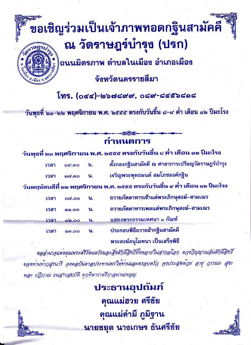 | หัวข้อกระทู้ : ***** ขอเรียนเชิญร่วมเป็นเจ้าภาพทอดกฐินสามัคคี ณ.วัดราษฏร์บำรุง ( ปรก ) ***** |