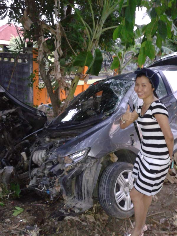 จึงเป็นเหตุให้รถเสียหลัก พุ่งชนเสาไฟฟ้าเข้าเต็มแรง จากนั้นรถหมุนและพลิกคว่ำ