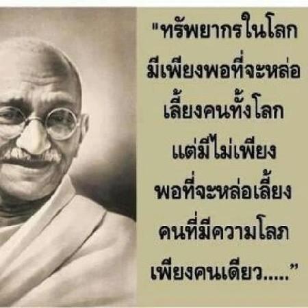 " ทรัพยากรทั้งโลก มีพอเพียงที่จะหล่อเลี้ยงคนทั้งโลก ที่มีไม่เพียงพอที่จะหล่อเลี้ยง คนที่มีความโลภเพียงคนเดียว " อยากรวยเอง ก็ต้องคิดเองได้ ทำบุญดีกว่า สบายจิตกว่าเยอะ 555