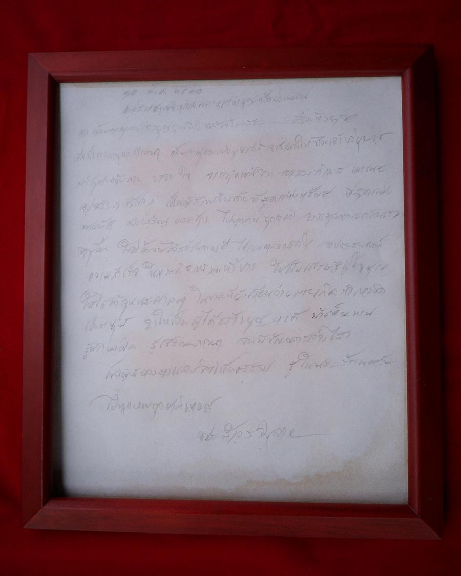 ในสมัยนั้น น้อยครั้งที่ผมจะมีโอกาสได้เห็นลายมือหลวงปู่ท่านเขียนเป็นข้อความต่างๆแบบต็มๆ เคยเห็นอยู่ครั้งหนึ่งในคราวที่พวกพี่ๆขออนุญาตเปิดสมุดจด ในวันที่หลวงปู่นัดที่จะไปงานพุทธาภิเษกต่างๆ นอกนั้นจะเห็นแค่อักขระยันต์ และที่หลวงปู่เขียนข้อความอวยพรที่ เวลามีศิษย์มาเช่ารูปหลวงปู่จากทางวัด และนำขึ้นมาให้หลวงปู่ทานจารยันต์อีกครั้งหนึ่ง ข้อความที่ท่านเขียนบ่อยคือ " เจริญรุ่งเรืองร่มเย็น " ในยุคนั้นมักมีศิษย์ที่มาพูดคุยกับหลวงปู่มักถามหลวงปู่ และคำที่มักได้ยินอยู่เป็นประจำบ่อยๆคือ " หลวงปู่เจ้าคะ หลังจากทำบุญแล้วจะอธิฐานอย่างไรถึงจะถูกต้องเจ้าคะ " ซึ่งคำถามนี้พวกพี่ๆก็เคยมานั่งคุยกันว่า เออ..จริงหลังจากทำบุญแล้วจะอธิษฐานอย่างไรให้ถูกต้อง เมื่อมีโอกาสกลุ่มพี่ๆและผม เมื่อคราวที่ได้ไปวัด ก็ได้เรียนถามหลวงปู่ หลวงปู่ท่านจึงพูดว่า " ดี...ถามดี " และให้หากระดาษมาให้หลวงปู่ ๑ แผ่น ทีแรกก็ฉีกกระดาษจากหนังสือปกอ่อนธรรมดา พอดีวันนั้นรุ่นพี่ที่ชื่อเฮียวีระชัยได้ซื้อกระดาษ ๑๐๐ ปอนด์มาพอดี เพราะเฮียวีระชัยจะเขียนภาพพระโพธิสัตว์กวนอิมถวายหลวงปู่ เฮียก็เลยบอกว่าให้ใช้กระดาษ ๑๐๐ ปอนด์ดีกว่า ก็นำตัดให้หลวงปู่ ท่านจึงหยิบดินสอเขียนเดี๋ยวนั้นเลย เอาไว้ให้กลุ่มคณะพี่ๆว่า เวลาทำบุญหรือก่อนนอนควรจะอธิฐานจิตอย่างไรให้ถูกต้อง จึงฝากภาพลายมือสุดยอดหายากของหลวงปู่พระอาจารย์ของพวกเรา ไว้ให้ศิษย์รุ่นหลังที่ไม่ทันท่านไว้ดูนะครับ ว่านี่คือลายมือของสุดยอดพระอริยสงฆ์องค์หนึ่งของประเทศไทย |