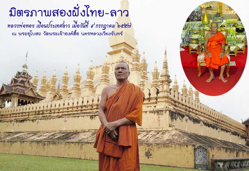 ด้วยบารมีของหลวงพ่อทอง ก้าวไกลถึงต่างแดน จึงเกิดวันนี้ขึ้น วันที่มิตรภาพของสองฝั่ง ไทย-ลาว ได้มาบรรจบกันอีกครั้ง ผ่านบารมีของหลวงพ่อทอง วัดพระพุทธบาทเขายายหอม และ "ญาท่านพระมหาผ่อง สมาเลิก" มหาสังฆนายก สาธารณรัฐประชาธิปไตยประชาชนลาว เจ้าอาวาสวัดพระเจ้าองค์ตื้อ นครหลวงเวียงจันทร์ เมื่อวันที่ 9 กรกฎาคม 2557 ณ พระอุโบสถ วัดพระเจ้าองค์ตื้อ นครหลวงเวียงจันทร์ ที่ผ่านมา |