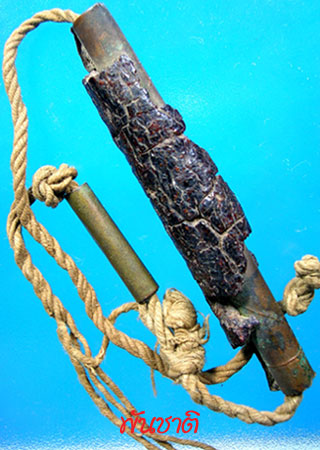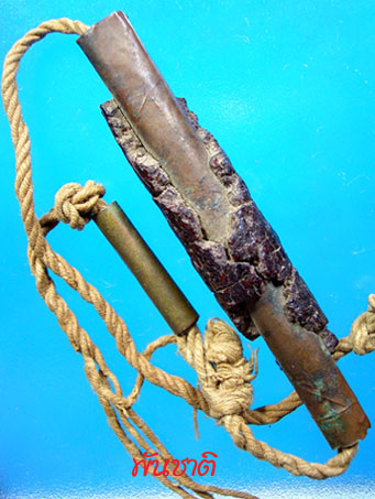 ตะกรุดดอกนี้เป็นตะกรุดทองแดงยาว 2.5 นิ้ว รอยเชือกมาเดิมๆ ดูคล้ายเป็นเชือกใหม่ แต่จริงผุขาดไปบ้างแล้วครับ เชือกที่ร้อยผ่านมีตะกรุดสาริกา ติดเดิมๆมาด้วยอีก 1 ดอก เพรียบพร้อมพุทธคุณทั้งคงกระพันชาตรีคลาดแคล้าวและเมตามหานิยมครบเสร็จครับ