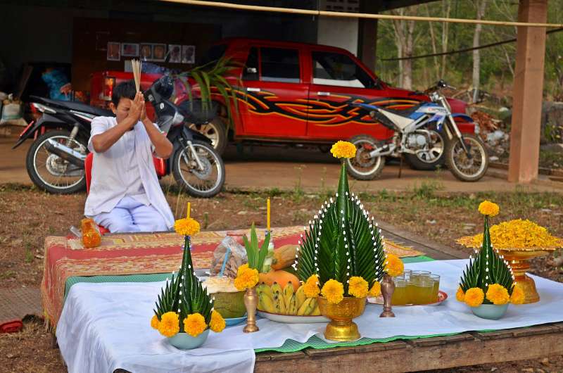 แม่ขาว( ร่างทรง ) ประกอบพิธีบรวงสรวง ในตอนเช้า แปดนาฬิกาเก้านาที ก่อนพิธีบวงสรวงฟ้าสว่างสดใส พอเริ่มพิธีบวงสรวง ปรากฏมีก้อนเมฆพากันพัดมาปิดจนมึดครึ้มไปทั่วทั้งวัด