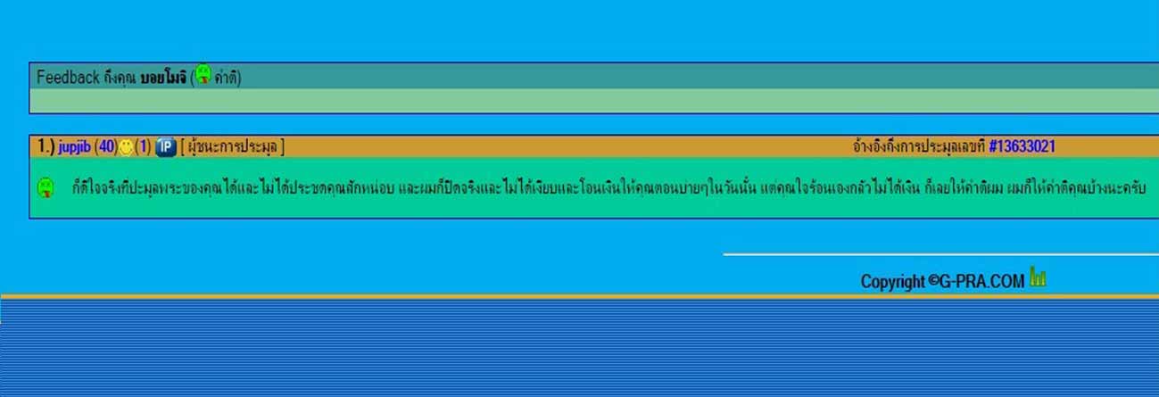 พี่เค้ามาปิดชนะประมูลได้ แต่ปิดแล้วเงียบไป 5 วันผมก็ส่งเมลล์บอกแล้วว่าชนะประมูล แต่กลับตอบกลับมาแบบประชดว่าครับดีใจครับ ผมรอวันที่ 8จึงโทรถาม ว่ารายการที่พี่ชนะยังสนใจรึเปล่า ก็บอกว่าสนใจจะโอนให้พรุ่งนี้ ช่วงสายๆ ผมรออีก 1 วัน ก็เงียบจึงให้ฟีดแบ็คไป ช่วงประมาณบ่าย2 มียอดเงินโอนมาแล้วดทรมาว่าโอนเงินให้แล้ว ช่วยแจ้งเว็บมาสเตอร์ให้ด้วยเรื่องฟีดแบ็คลบ ผมก็แจ้งไปแล้ว แต่ตรงนี้ขึ้นอยู่กับการพิจารณาของเว็บมาสเตอร์ครับ ผมไม่มีอำนาจลบคำติได้ พี่เค้าจึงมารยาทดีให้คำติลบผมมา เนื่องจากอะไรไม่ทราบ ///พูดไปก็แค่เป็นการพูดฝ่ายเดียวครับ ฝากพี่ๆพิจารณาจากรูปน่ะครับ |