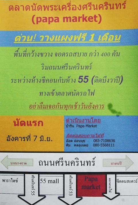 ตลาดนัดพระเครื่องศรีนครินทร์ (อยู่ติดถ.ศรีนครินทร์ ระหว่างห้าง ซึคอนสแควร์ กับ ห้าง 55 พลาซ่า (ภายในบริเวณตลาด papa มาร์เก็ต ตลาดวินเทจ ของเก่า งานตกแต่งไสตล์ย้อนยุค) ติดซอยศรีนครินทร์ 53
