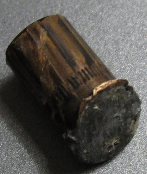 เมื่อเช้า 5/12/51 เวลาประมาณ 4.00 น. ผมกำลังหลับเพลินๆ อยู่ก็สะดุ้งได้ยินเสียงดังที่หลังคา ดังจนตื่นทั้งบ้าน นึกอยู่ว่าไม่ใครปาหลังคาบ้านก็ซีเมนต์ที่ยาแนวสันหลังคาตกลงมาแน่(เคยตก) เลยไม่ใส่ใจจนเช้าดูที่พื้นห้องมีเศษฝาแตกตกอยู่ดูไปมาเจอหัวลูกปืนบนผ้าห่ม ห่างจากที่นอนไม่ถึงคืบ ถ้าเข้ามาอีกสัก 50 ซม. โดนลูกสาวผมที่นอนอยู่กลางแน่นอน เลยนึกทันทีว่าคุณพระช่วยคุ้มครอง จากนั้นนึกต่อมาว่า แล้วใครมันจะมาจ่ายเงินค่าซ่อมหลังคากับฝ้าให้ตูว๊ะ เฮ้อฟาดเคราะห์ครับ เพราะถ้าโดนคนเจ็บแน่ (หลังคาที่บ้านหนาประมาณ 1 นิ้ว วางมุมเฉียงประมาณ 45 องศา เลยหนา 1.42 นิ้ว ฝ้าอีก 1 ซม. ทะลุลงมาเลยครับ) |