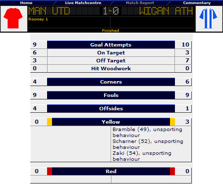 เข้าสู่ช่วงท้ายเกมแมนฯยู ไม่สามารถทำอะไร วีแกน ได้อีก จบเกม 90 นาที เจ้าบ้าน"ผีแดง"เฉือนเอาชนะ วีแกน ไปได้ 1:0 เก็บ 3 คะแนนได้สำเร็จขึ้นไปเป็นรองจ่าฝูงแทนที่ของเชลซี มีแต้ม 44 คะแนน ตามหลังลิเวอร์พูล 2 แต้มเท่านั้น