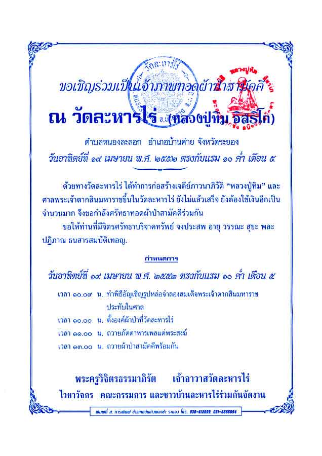 จึงขอเชิญชวนข้าทหารเก่าคู่ชีพในอดีตกาล, ศิษยานุศิษย์และ ผู้ที่เคารพศรัทธา ผู้ตั้งมั่นในความกตัญญูกตเวที ร่วมบริจาคปัจจัยเพื่อถวายเป็นผ้าป่าร่วมกตัญญูต่อพระองค์ร่วมกันอัญเชิญพระบรมรูปสมเด็จพระเจ้าตากสินมหาราชขึ้นประดิษฐานบนพระแท่นบัลลังก์ พร้อมทั้งเป็นเจ้าภาพทอดผ้าป่าสามัคคี ถวายวัดละหารไร่