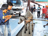 ช่วยวัว- เจ้าหน้าที่ใช้รถเครนยกวัวเพศเมีย ที่ตกจากรถขณะนำไปโรงฆ่าสัตว์ แล้วตื่นสถานที่วิ่งเข้าไปในปั๊มน้ำมันเชลล์ ย่านนวมินทร์ ตกลงไปในร่องเปลี่ยนน้ำมันเครื่องรถยนต์ ช่วยออกมาได้อย่างปลอดภัย