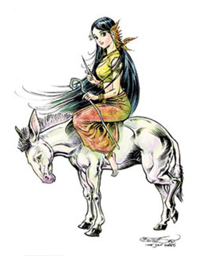 นางสงกรานต์ นามว่า นางมณฑา ... ทัดดอกจำปา เครื่องประดับไพทูรย์ ภักษาหารนมเนย หัตถ์ขวาถือเหล็กแหลม หัตถ์ซ้ายถือไม้เท้า มีลาเป็นพาหนะ