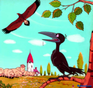 1.นกกายืมมือนกเหยี่ยวให้ขโมยลูกแกะและนกกาก็จะมาแย่งหรือขโขยเศษเนื้อลูกแกะจากนกเหยี่ยวอีกทีหนึ่ง