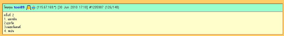 | หัวข้อกระทู้ : ประกาศผู้ีโชคดี ทาย 4 ทีมที่เข้ารอบรองชนะเลิศ ถูกทั้ง4 ทีมถูกเป็นท่านแรกครับ |