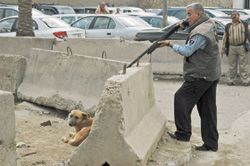 ฆ่าแหลก - ตำรวจประเทศอิรักประทับปืนลูกซองเล็งยิงใส่หัวสุนัขจรจัดตายคาที่ บนท้องถนนกรุงแบกแดด ตามนโยบายปราบสุนัจจรจัดในแบกแดด ซึ่ง 3 เดือนที่ผ่านมาไล่ยิงและวางยาเบื่อสุนัขตายไปแล้วเกือบ 6 หมื่นตัว (แฟ้มภาพ/เอพี)