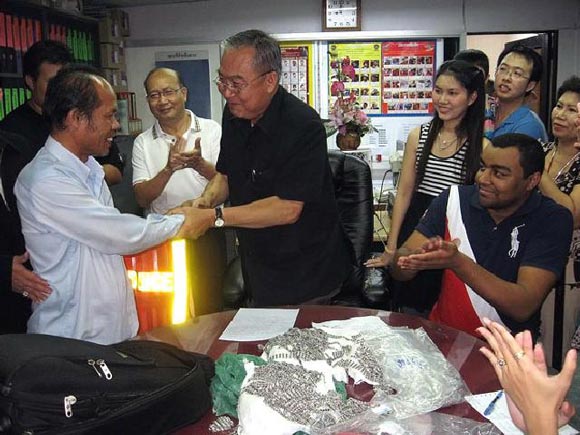 เมื่อช่วงดึก วันที่ 8 ต.ค. พ.ต.อ.ขิง แขวงวิเศษชัยชาญ ผกก.สน.ชนะสงคราม นายอเล็กซานเดอร์ ชัวร์ซา ริเบอโร่ อายุ 28 ปี พ่อค้าเครื่องเงินชาวบราซิล และเจ้าหน้าที่ จส.100 ร่วมกันแถลงข่าวที่ห้องฝ่ายสืบสวน เพื่อขอบคุณนายพิสูจน์ สมุทรโอวาท อายุ 50 ปี อยู่บ้านเลขที่ 219/639 หมู่ 12 ต.อ้อมน้อย อ.กระทุ่มแบน จ.สมุทสาคร คนขับรถแท็กซี่เก็บเครื่องเงินรูปพรรณ มูลค่าประมาณ 1 ล้านบาทส่งคืนให้นายอเล็กซานเดอร์