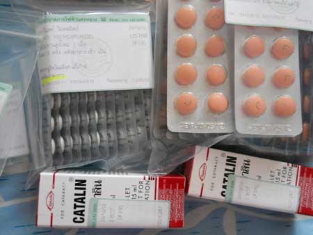วันนี้ผมไปพบแพทย์ที่โรงพยาบาลไฟฟ้านครหลวงเพื่อเจาะเลือดหาค่าน้ำตาล+ไขมันในเส้นเลือดและขอยามากิน ทุกๆสองเดือน .... ลองชมภาพซองยาที่หมอจ่ายมาให้นะครับ รวมยาหยอดตาบันเทาการจับตัวแข็งของโปรตีน ทำให้เป็นต้อกระจกด้วยครับ ... รวมแล้ว เป็นยา 9 ขนาด/อย่าง ครับ  |