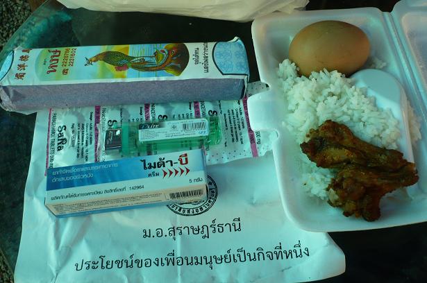 ได้รับข้าว1กล่อง(มีไข่ต้ม ไก่ทอด อร่อยครับ)ของม.อ. สุราษฎร์ธานี มีเทียน ยาพารา ไฟเช็ค ยาแก้น้ำกัดเท้า กราบขอบพระคุณทางม.อ. อีกครั้งครับ
