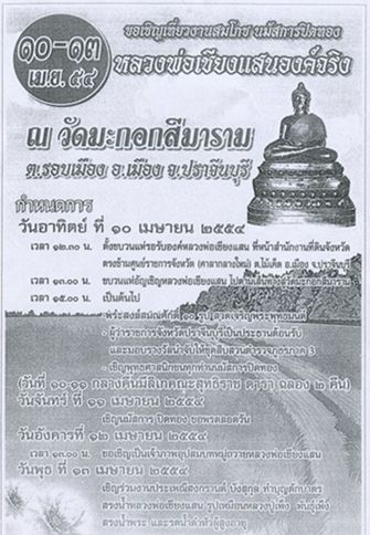 พี่น้องชาวปราจีนบุรี จึงร่วมกันจัดงาน นมัสการปิดทอง หลวงพ่อเชียงแสน โดยมีกำหนดการ ตามรูปครับ