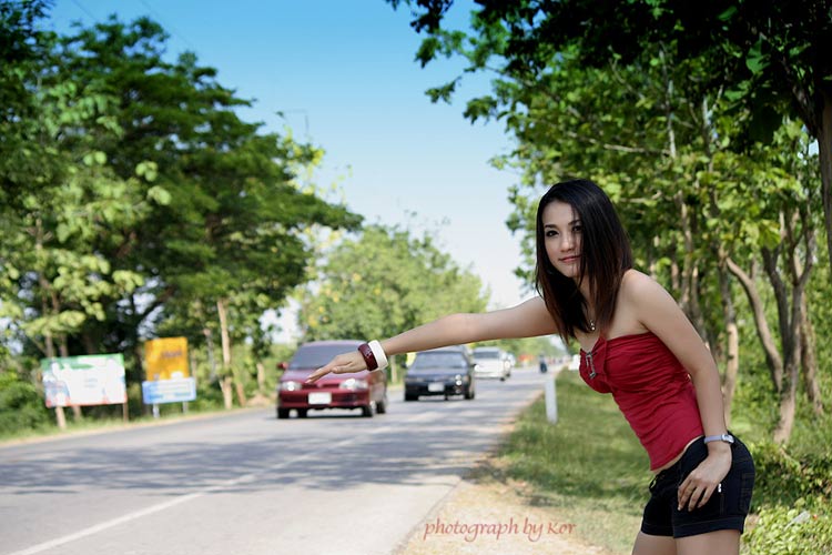 *ข้างทาง มีผู้หญิงชาวต่างชาติ (ฝรั่ง) ยืนโบกรถ สวยด้วยละครับ