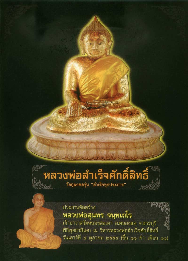 กำหนดพิธีพุทธาภิเษกวัตถุมงคลรุ่น "สำเร็จทุกประการ" ที่ทางวัดหนองสะเดา อ.หนองแค จ.สระบุรี โดยมีพระเดชพระคุณ หลวงพ่อสุนทร จนฺเถโร เจ้าอาวาสเป็นประธานจัดสร้าง ในวันเสาร์ (ขึ้น ๑๑ ค่ำ เดือน ๑๑) ที่ ๘ ตุลาคม ๒๕๕๔ เวลา ๑๔.๑๙ น. ณ วิหารหลวงพ่อสำเร็จศักดิ์สิทธิ์ ริมคลองรพีพัฒน์ ตลาดหนองตาโล่ จ.สระบุรี |